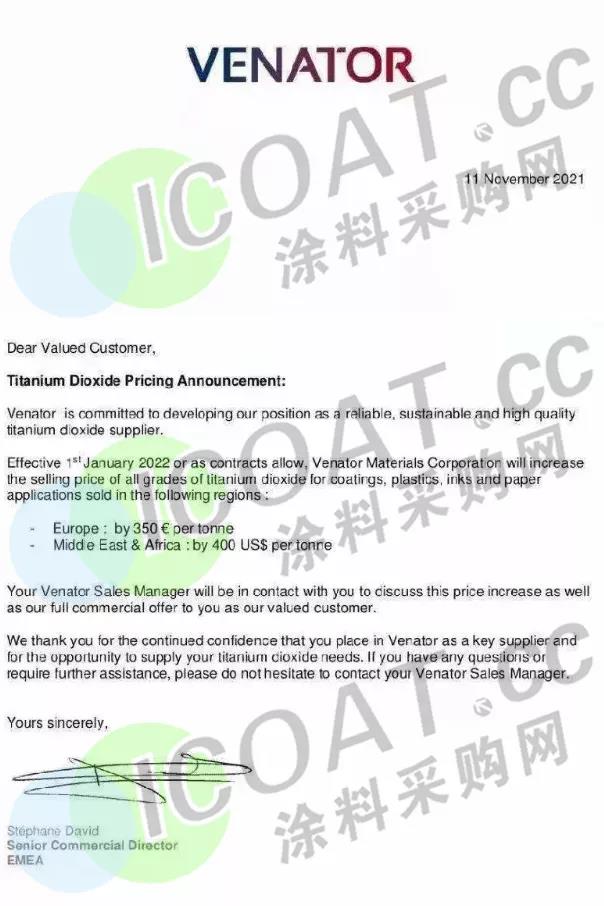 泛能拓(Venator):2022年1月1日起,將提高在下列地區(qū)銷(xiāo)售的涂料、塑料、油墨和紙張應(yīng)用的所有等級(jí)二氧化鈦的售價(jià):
