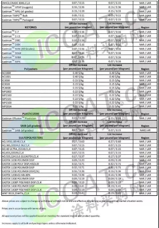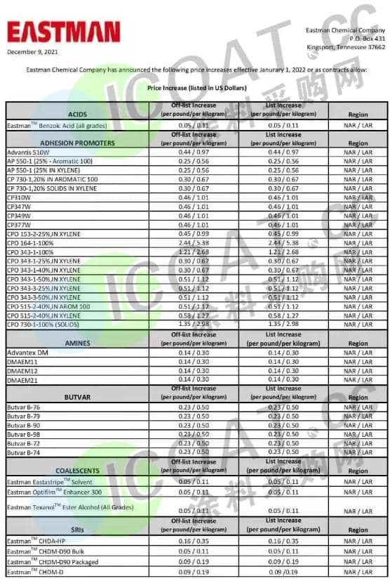 亨斯邁:自2022年1月1日起,將對(duì)部分產(chǎn)品進(jìn)行漲價(jià),漲幅最高可達(dá)40%。其中雙酚F環(huán)氧上漲5%、脂環(huán)族環(huán)氧上漲9%、多官能團(tuán)環(huán)氧上漲9%、改性/固體/液體/溶劑型環(huán)氧上漲 $0.2/Ib(折合2800元/噸)。