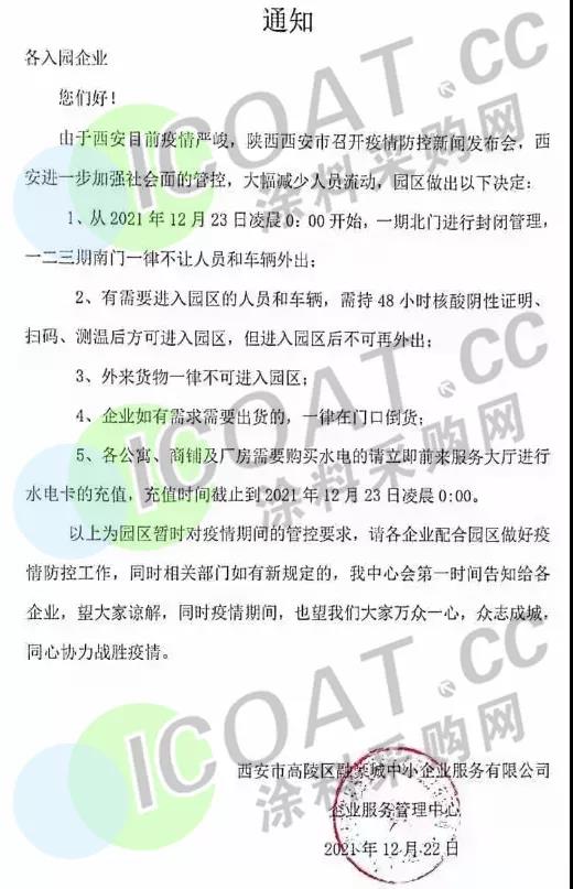 當(dāng)?shù)啬?a href="http://www.expthink.com/news/list_19.html" target="_blank" class="keylink">涂料企業(yè)曬出了所在園區(qū)發(fā)布的通知,通知明確,12月23日凌晨0:00起,一期北門進行封閉管理,一二三期南門一律不讓人員和車輛外出;有需要進入園區(qū)的人員和車輛,需持48小時核酸陰性證明、掃碼、測溫后方可進入園區(qū),但進入園區(qū)后不可再外出;外來貨物一律不可進入園區(qū);如有需求需要出貨的,一律在門口倒貨。
