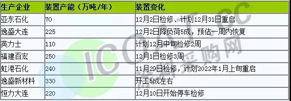 PTA的產(chǎn)能分布中,前三名是浙江省,遼寧省及江蘇省,無論是浙江地區(qū)的疫情嚴(yán)峻,還是江蘇地區(qū)的能耗雙控趨嚴(yán),都給PTA企業(yè)的開工率生產(chǎn)和貨物運輸帶來了影響。同時年末PTA裝置集中檢修也帶來了供應(yīng)端縮減,給市場帶來提振。