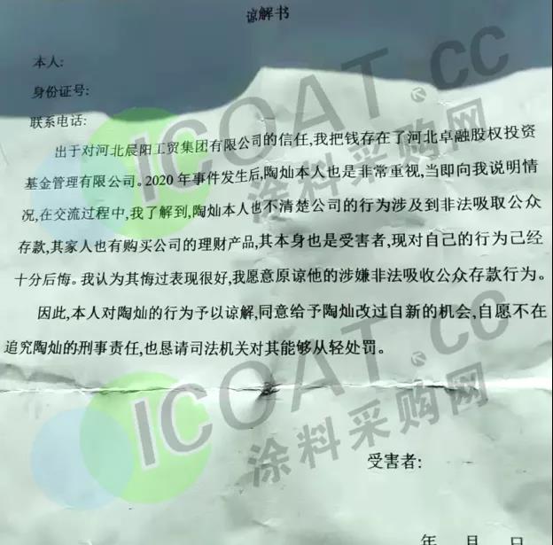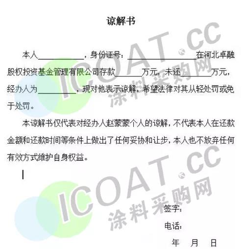 通過債權人提供的兩份諒解書內容可以看出,兩版文件內容并不一致,其中都提到了不再追究業務員的刑事責任希望能夠對其從輕處罰,但電子版文件明確“不代表在還款金額和時間等條件上做出妥協和讓步”。盡管如此,多數債權人還是表示不愿簽署,不認同這個諒解書的措辭。一方面覺得在拿到全部本息之前對業務員的所謂“諒解”沒有任何意義,另一方面,也擔心自己一旦“簽字畫押”,很有可能被人利用,在文本上進行修改和“添油加醋”,最終糊里糊涂的“自愿”放棄了債權人權力。