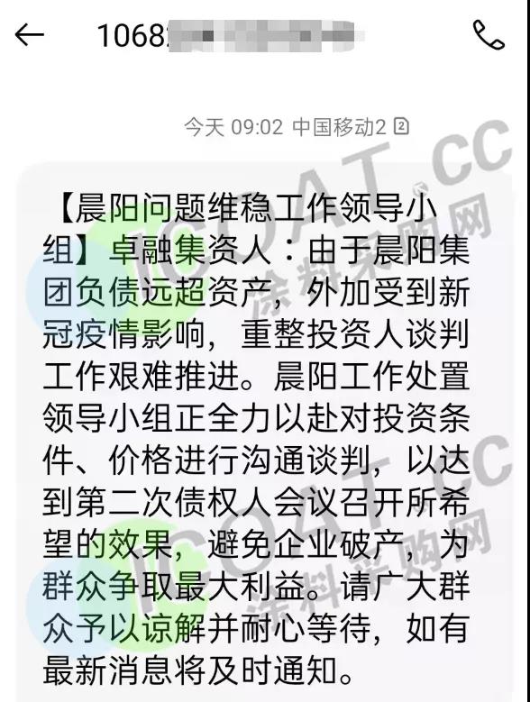 臨近年末,晨陽債權人仍沒有停下追償的腳步,無論是試圖與當地政府進行溝通,還是對于業務員和相關人員的電話詢問,他們都在竭盡全力的維護自身的權益,不希望自己辛苦掙來的錢變成“非法融資”繼而難以收回,但結果并不如人意。部分債權人曬出了近期收到的短信,短信稱二次債權人會議已經推遲,且尚未給出準確的時間。