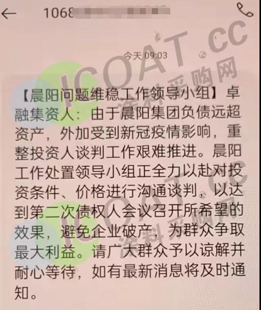 盡管晨陽集團目前的處境比較艱難困苦,但這一切問題都沒能扯下晨陽水漆的“遮羞布”,晨陽水漆該生產生產,該賣貨賣貨,頗有一種“虱子多了不咬,債多了不愁”的氣魄。對于晨陽水漆正常生產開工銷售的情況,部分債權人表示,沒停工可能是好事,能掙到錢也許就能還錢。但是眼看著2021年即將收尾,連辛丑年農歷年也即將結束,債權人會議沒有著落,金融基金本息也沒有絲毫動靜。對于此前盛傳的金隅集團收購事宜更是音信全無,難道3000余債權人真的熬不過這個寒冬了嗎?還是晨陽水漆會 “甩包袱”的方式來處理。