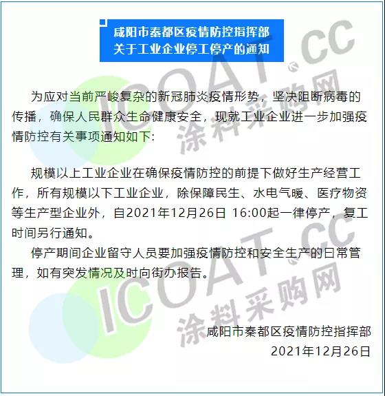 陜西咸陽秦都區:所有規模以下工業企業,除保障民生、水電氣暖、醫療物資等生產型企業外,自2021年12月26日 16:00起一律停產,復工時間另行通知。轄區所有房屋建筑和市政基礎設施工程(除地鐵施工外)從2021年12月26日16: 00起全部停工。