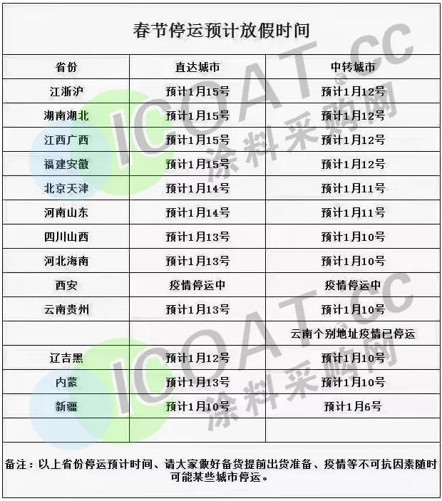 據涂料采購網不完全統計,目前已有十幾個地區在寒潮天氣、重污染預警、疫情封控等因素的影響下停工、停產、停運、停航,其中包括浙江、四川、貴州、陜西等化工重鎮,覆蓋化工企業數萬家,選擇提前放假的企業更是數不勝數,將影響鈦白粉、磷化工、煤化工等多個產業鏈的化工品供給,下游有訂單的企業需要提前備貨了。