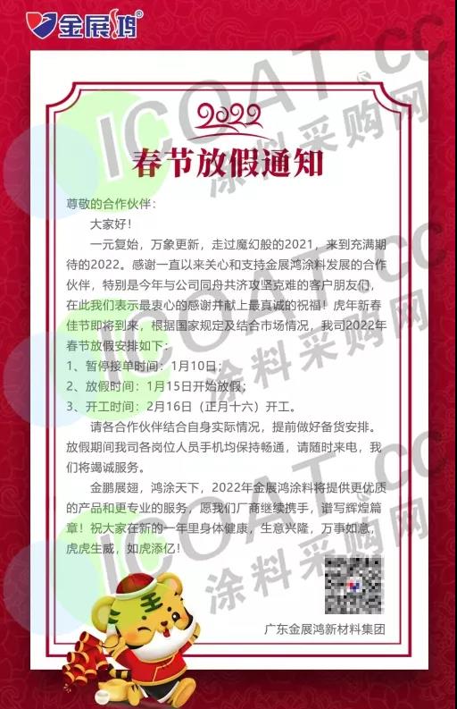 廣東金展鴻新材料集團:1月10日暫停接單,1月15日開始放假,2月16日(正月十六)開工。