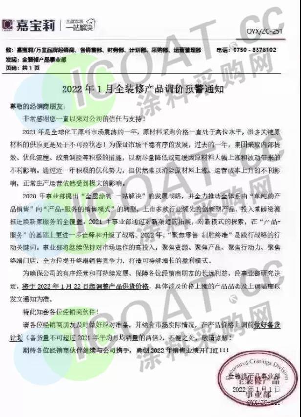 漲價函還提醒各位經銷商及時做好應對準備,并結合市場實際情況,在產品價格上調前做好備貨計劃(備貨量不可超過2021年平均月均銷量的兩倍)。一邊宣布漲價,一邊要求限量銷售,這種情況無疑給2022年的涂料行業的處境拉響了“警報”。
