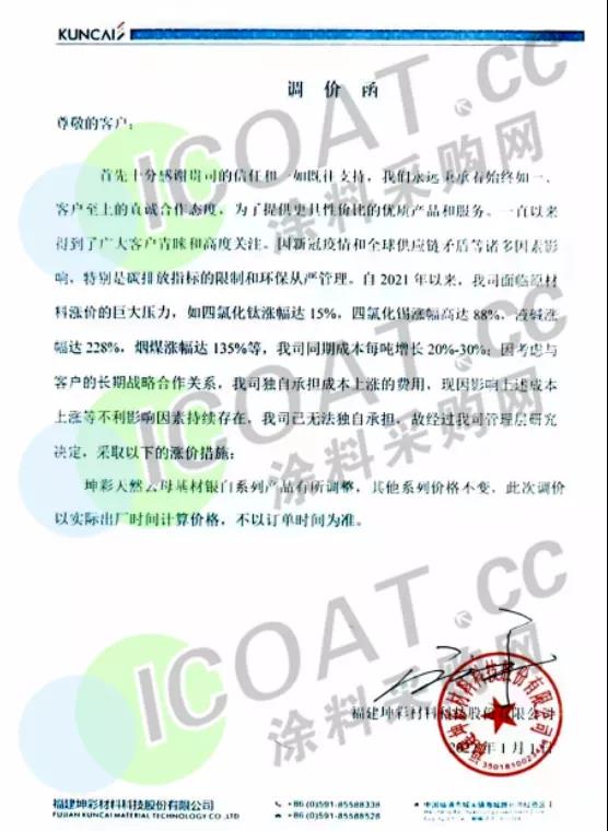 ?鈦白粉方面,海外的科慕、康諾斯、泛能拓、日本石原等龍頭宣布2022年調漲300-400美元/噸左右,國內的龍佰集團、中核鈦白等20多家企業也公告2022年提漲1000元/噸左右,無論是國內的中低端鈦白粉還是海外的高端氯化法鈦白粉都進行了同步調漲,對于涂料行業無疑是雙重夾擊。