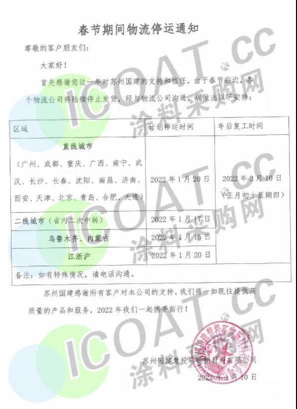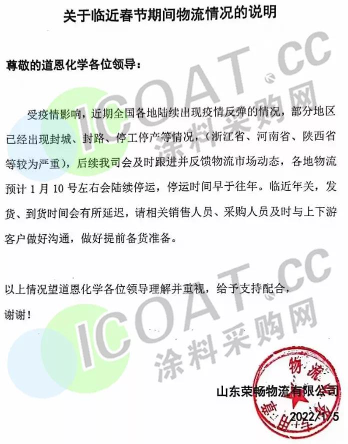 盡管各地對于網傳的2022年快遞停運消息進行辟謠,但對于化工人而言,更重要的是,所在地區的物流公司公布的直達運輸和中轉運輸停收時間。目前來看,多地的物流停運普遍在15-20日左右,部分地區已于10日左右停止物流接單。除了臨近春節的物流停運外,部分地區疫情散點爆發和反撲,也造成很多地區開啟了臨時性的交通管制,跨省運輸出入也陷入停滯狀態,無疑“堵死”了涂料企業采購和銷售的出路。