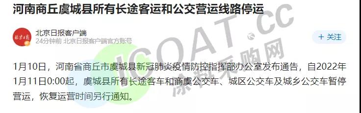 河南:自2022年1月11日0:00起,虞城縣所有長途客車和商虞公交車、城區公交車及城鄉公交車暫停營運,恢復運營時間另行通知。新安縣政府對已經感染新冠的群眾所在村鎮實行封閉式的管理,不僅嚴禁一切形式的聚集活動,并且立即停運交通工具;孟津區部分公交線路暫時停運;禹州全域只進不出,采取停運、停課、勸返等緊急措施。