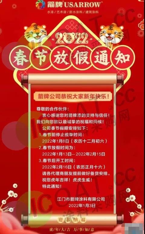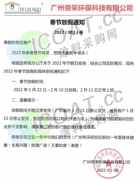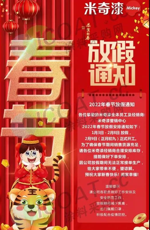中山市美格涂料:截單時間:2022年1月13日;放假時間:自2022年1月19日至2022年2月9日;上班時間:2022年2月10日。