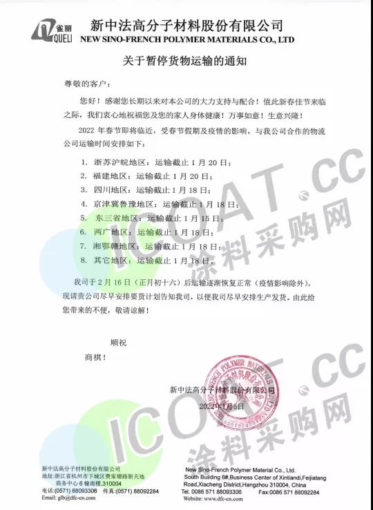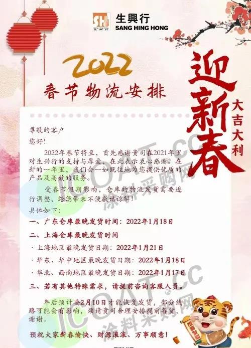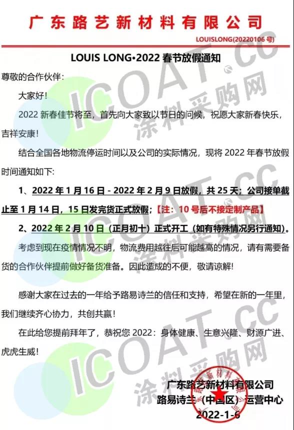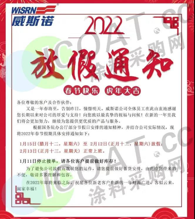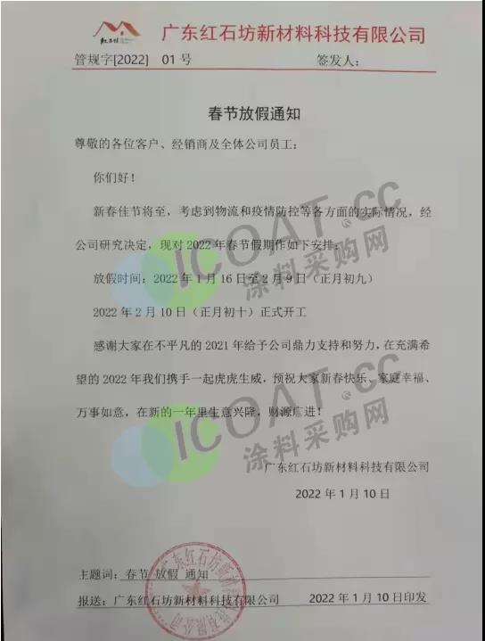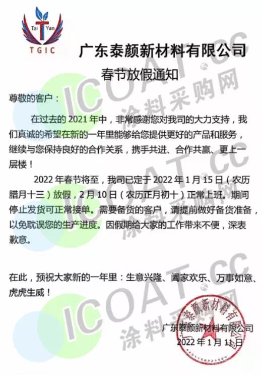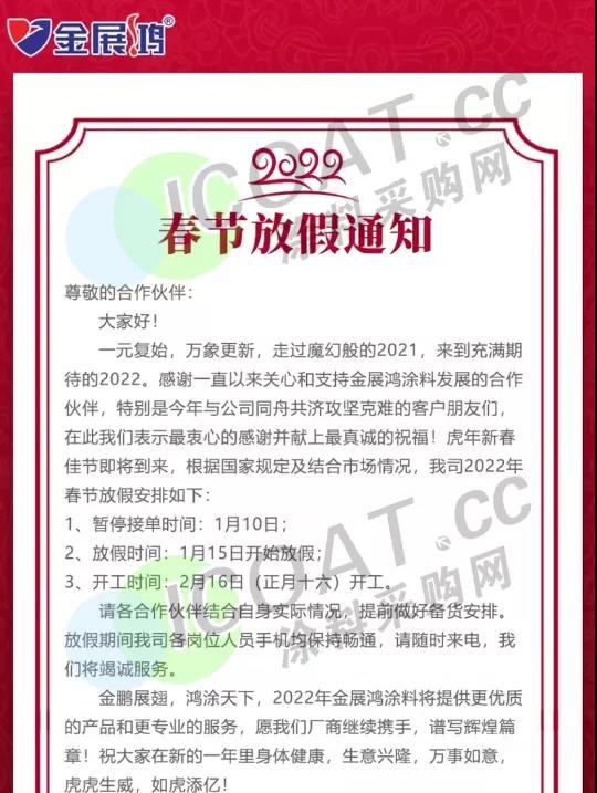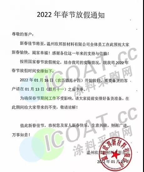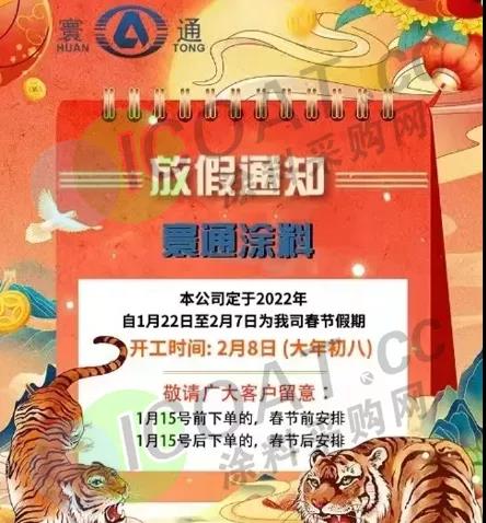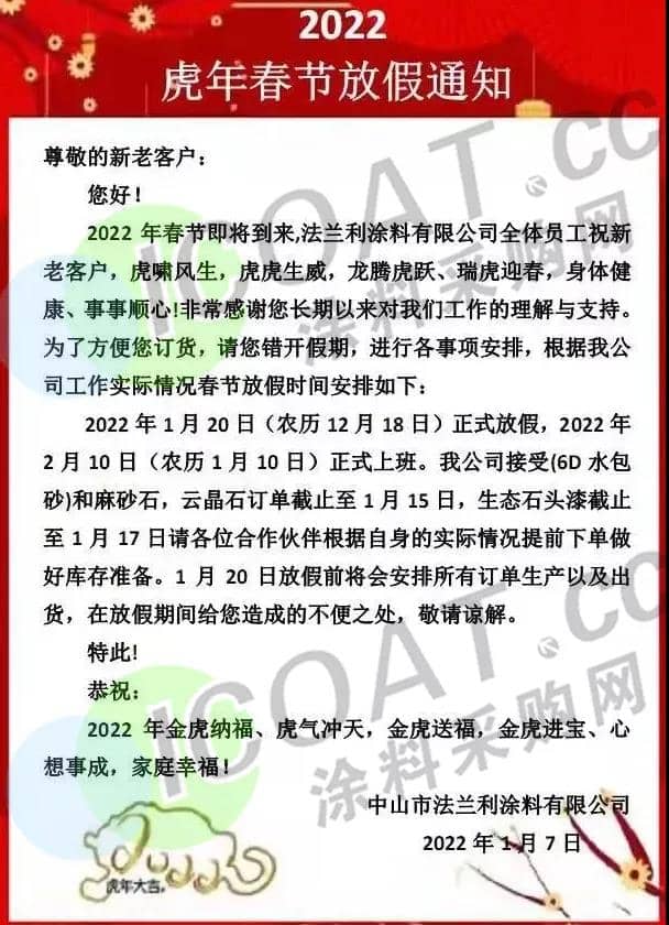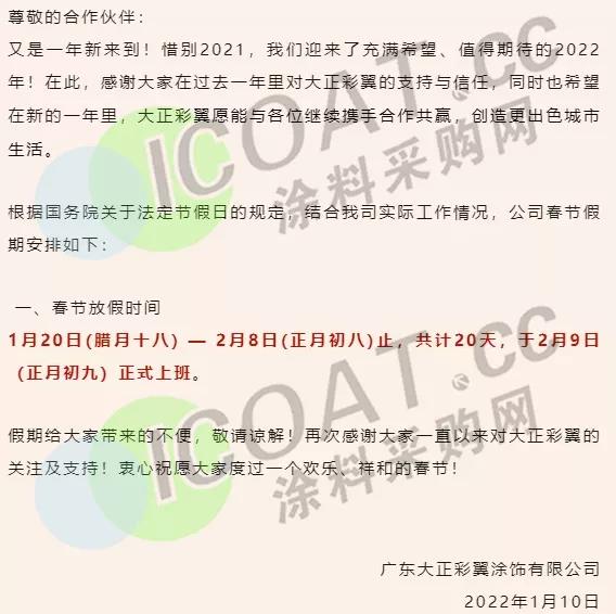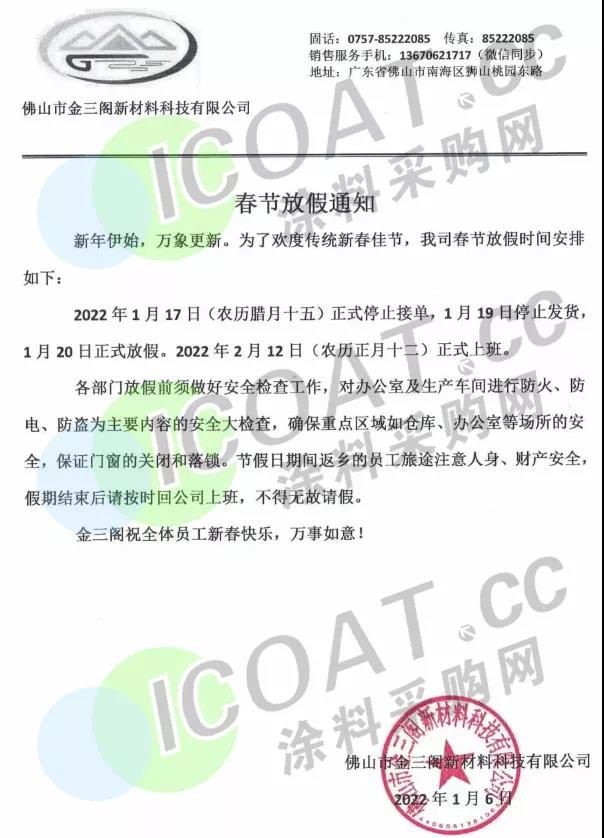 佛山市五福涂料:將于2022年1月16日至2月8日放假調休。1月13日停止接單,2022年2月9日正常營業。