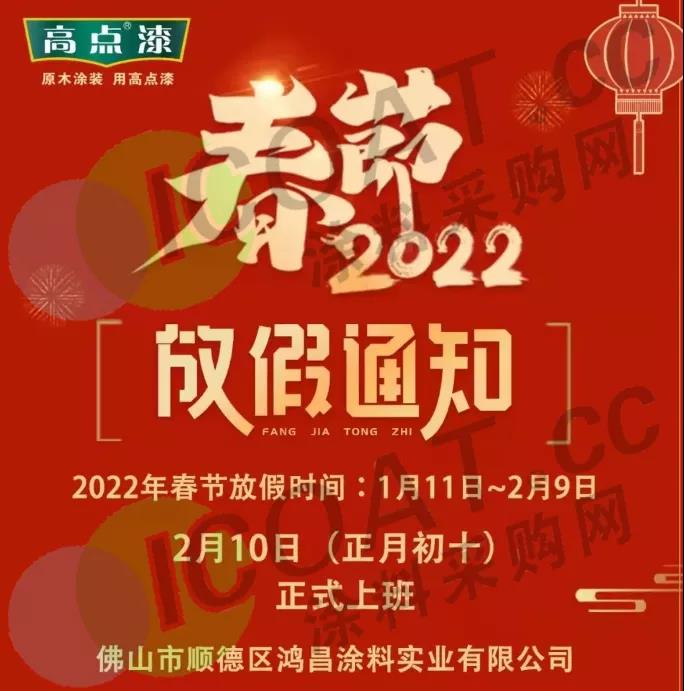 佛山市順德區鴻昌涂料:1月11日~2月9日放假,2月10日正式上班。
