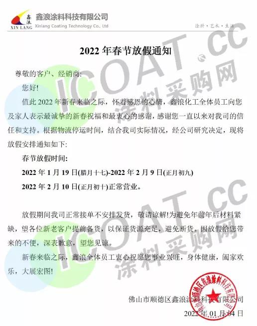 鑫浪涂料:2022年1月19日——2022年2月9日放假,2022年2月10日正常營業。