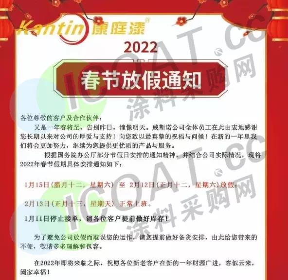 據涂料采購網了解,2022年以來,已有30余家涂料、化工企業發布了放假通知,最早于本月3日已經開始放假,最晚開工時間為2月16日(正月十六),最長放假37天。與往年相比,2022年許多涂料企業的放假提前了不少,且明確放假期間不生產、不發貨、不接單,提醒客戶提早安排備貨事宜。