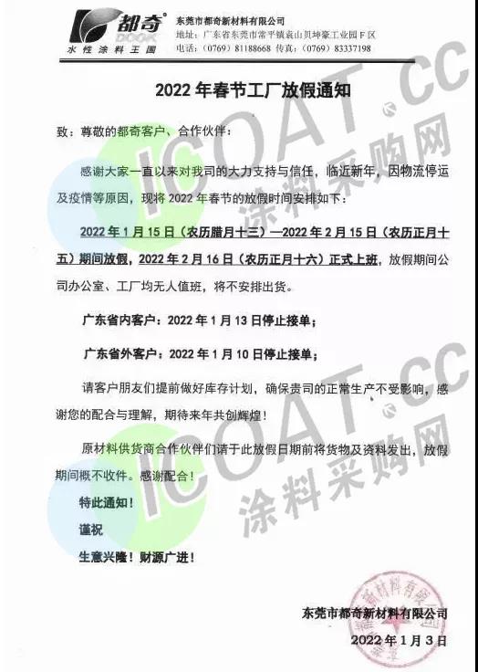 東莞市都奇新材料:2022年1月15日-2022年2月15日期間放假,2022年2月16日正式上班,放假期間公司辦公室、工廠均無人值班,將不安排出貨。廣東省內客戶:2022年1月13日停止接單;廣東省外客戶:2022年1月10日停止接單。