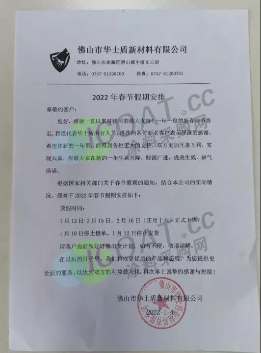 佛山市華士盾新材料:放假時間:1月12日-2月15日,2月16日正式上班。1月10日停止接單,1月12日停止發貨,請客戶提前做好訂單出貨計劃。