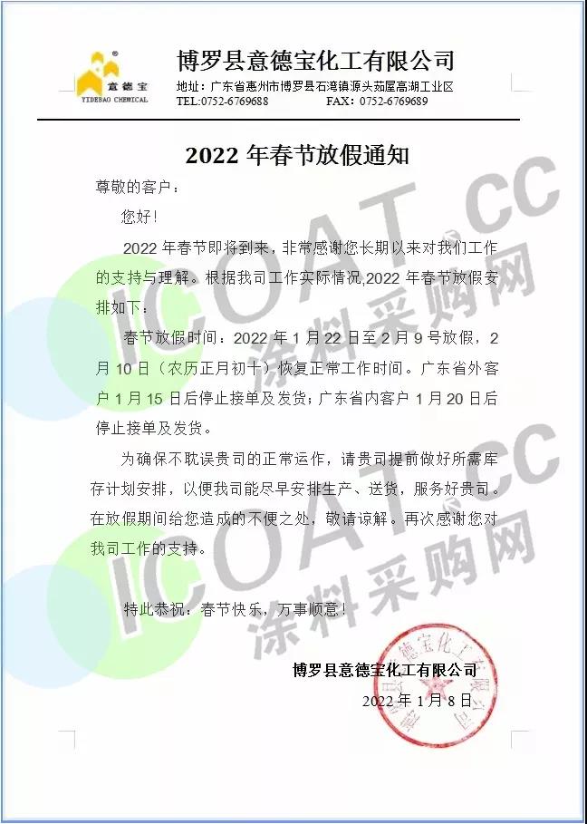 博羅縣意德寶化工:1月22日至2月9日放假,2月10日恢復正常工作時間,廣東省外客戶1月15日后停止接單及發貨;廣東省內客戶1月20日后停止接單及發貨。