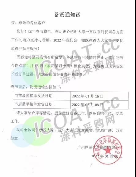 肇慶華欣特化工涂料:接單截止時間:2022年1月10日,發貨截止時間:2022年1月15日。2022年1月15日至2月7日放假調休。2022年2月8日正式上班。