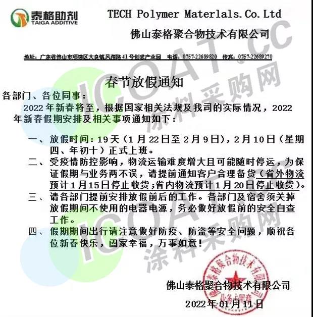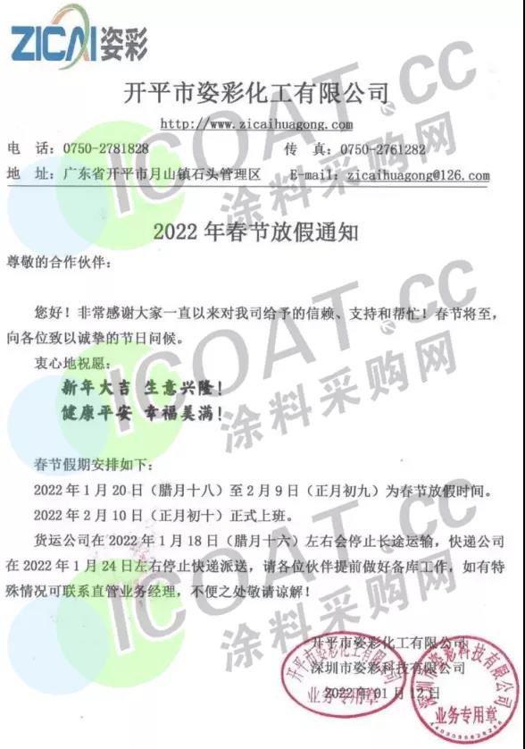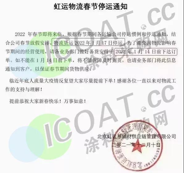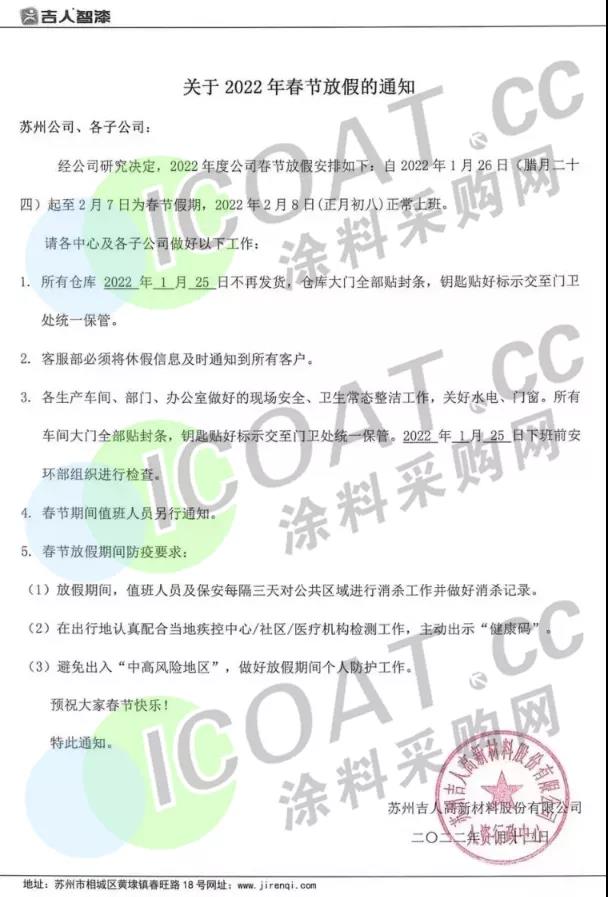眼看離春節還有十幾天的光景,部分涂料、化工企業已經開始放假,物流運輸也幾近暫停,忙碌了一年的化工人也基本結束了工作,或是準備過年。涂料采購網在這里提醒大家,外出和返鄉時要做好個人防護,嚴格限制前往中、高風險地區及所在縣(市、區、旗),非必要不前往中、高風險地區所在地市的其他縣(市、區、旗),無論身處何地,注意安全防護,平平安安度過春節。