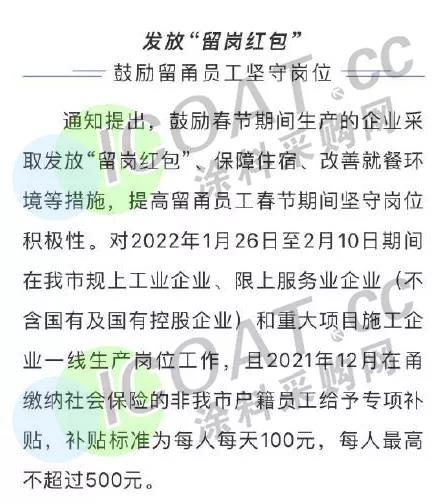 對于企業留溫過年員工人數50人以上的、100人以上的,分別給予企業5萬元、10萬元留崗補助。