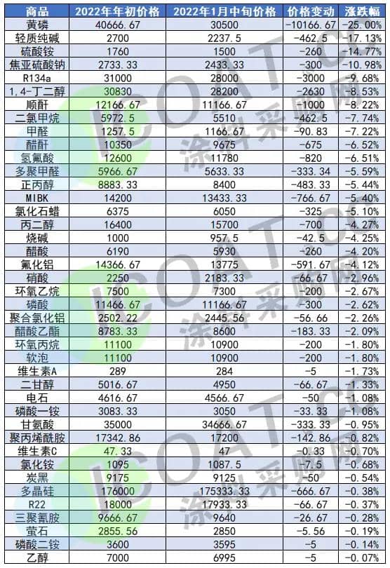 據(jù)涂料采購網(wǎng)不完全統(tǒng)計,2022年開年以來已有幾十種化工品價格下跌,如今距離春節(jié)假期不到半月,下游剛需采購不多,物流也在陸續(xù)停運,疊加疫情多點爆發(fā)帶來的下游房地產(chǎn)、基建項目、汽車制造等行業(yè)停工面逐漸加大,市場逐步趨冷,導(dǎo)致化工品需求銳減。部分化工廠為防止春節(jié)期間累庫,故而下調(diào)了出廠報價,但仍未出現(xiàn)期待中的下游抄底補貨的情況。