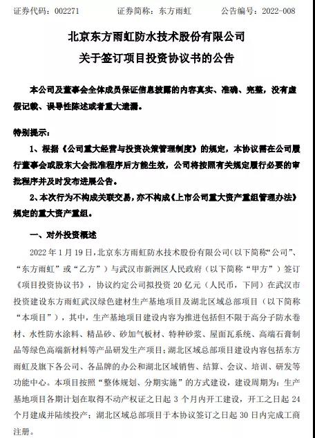 據(jù)東方雨虹近日發(fā)布公告,北京東方雨虹防水技術(shù)股份有限公司(以下簡(jiǎn)稱“公司”、“東方雨虹”或“乙方”)與武漢市新洲區(qū)人民政府(以下簡(jiǎn)稱“甲方”)簽訂《項(xiàng)目投資協(xié)議書》,協(xié)議約定公司擬投資20億元(人民幣,下同)在武漢市投資建設(shè)東方雨虹武漢綠色建材生產(chǎn)基地項(xiàng)目及湖北區(qū)域總部項(xiàng)目。