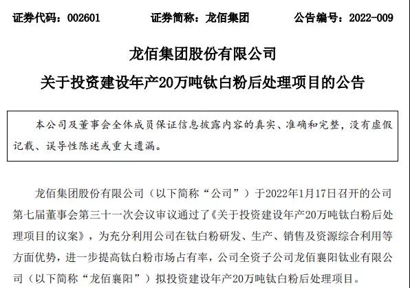 龍佰集團(tuán)發(fā)布公告,為充分利用公司在鈦白粉研發(fā)、生產(chǎn)、銷售及資源綜合利用等方面優(yōu)勢,進(jìn)一步提高鈦白粉市場占有率,公司全資子公司龍佰襄陽鈦業(yè)有限公司擬投資建設(shè)年產(chǎn)20萬噸鈦白粉后處理項目,項目總投資10億元。