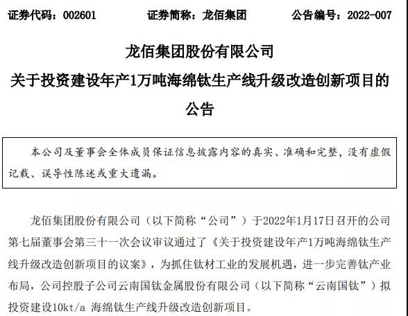 龍佰集團(tuán)發(fā)布公告,為抓住鈦材工業(yè)的發(fā)展機(jī)遇,進(jìn)一步完善鈦產(chǎn)業(yè)布局,公司控股子公司云南國鈦金屬股份有限公司(以下簡稱“云南國鈦”)擬投資建設(shè)10kt/a 海綿鈦生產(chǎn)線升級改造創(chuàng)新項目。