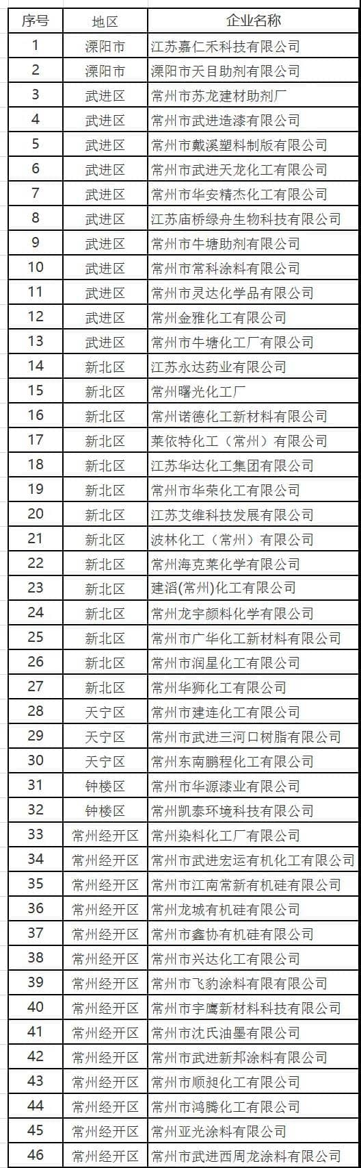 近日,江蘇省常州市工業和信息化局公示2021年常州市已關停江蘇嘉仁禾科技有限公司等46家化工生產企業名單。