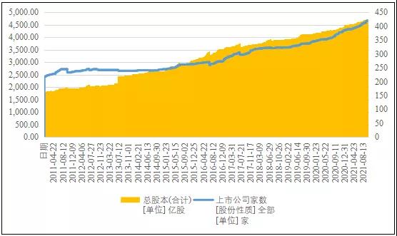 圖12 近年來中國化學行業上市公司總股本量及家數情況