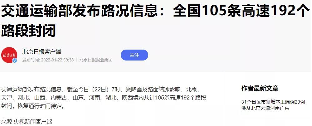 近日,交通運(yùn)輸部發(fā)布路況信息,截至22日7時(shí),受降雪及路面結(jié)冰影響,北京、天津、河北、山西、內(nèi)蒙古、山東、河南、湖北、陜西境內(nèi)共計(jì)105條高速192個(gè)路段封閉,恢復(fù)通行時(shí)間待定。