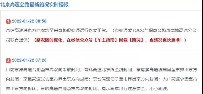 京津高速臺(tái)湖至市界雙向采取封閉;首環(huán)高速北京段全線封閉;京港澳高速琉璃河至市界出京方向封閉;京昆高速張坊至市界出京方向封閉;京臺(tái)高速佃子至市界出京方向封閉;大廣高速求賢至市界出京方向封閉;京哈高速白鹿至市界雙向封閉。