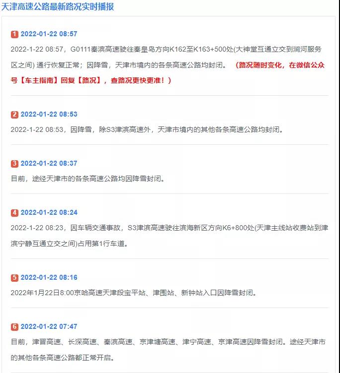 因降雪,除S3津?yàn)I高速外,天津市境內(nèi)的其他各條高速公路均封閉;G0111秦濱高速駛往秦皇島方向K196+750處(塘承秦濱互通立交附近)斷交。