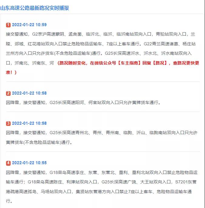因降雪,G25長深高速陽河、何官站雙向入口只允許黃牌貨車通行;G18榮烏高速李莊、東營、東營北、墾利、墾利北站雙向入口禁止危險(xiǎn)物品運(yùn)輸車通行;G18榮烏高速陳莊、利津站雙向入口,G25長深高速廣饒、大王站雙向入口,S7201東營港疏港高速孤島、馬場(chǎng)站雙向入口,集賢站東營港方向入口禁止7座以上客車、危險(xiǎn)物品運(yùn)輸車通行。