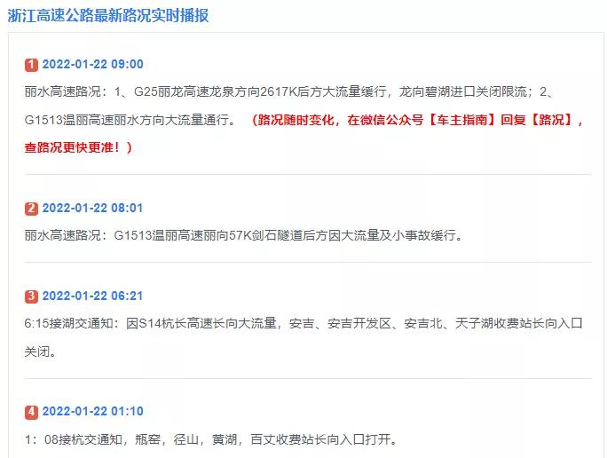 G25麗龍高速龍泉方向2617K后方大流量緩行,龍向碧湖進(jìn)口關(guān)閉限流;因S14杭長高速長向大流量,安吉、安吉開發(fā)區(qū)、安吉北、天子湖收費(fèi)站長向入口關(guān)閉。