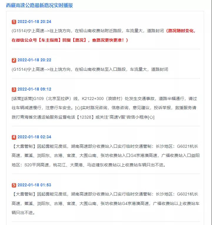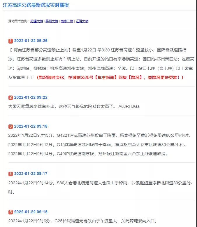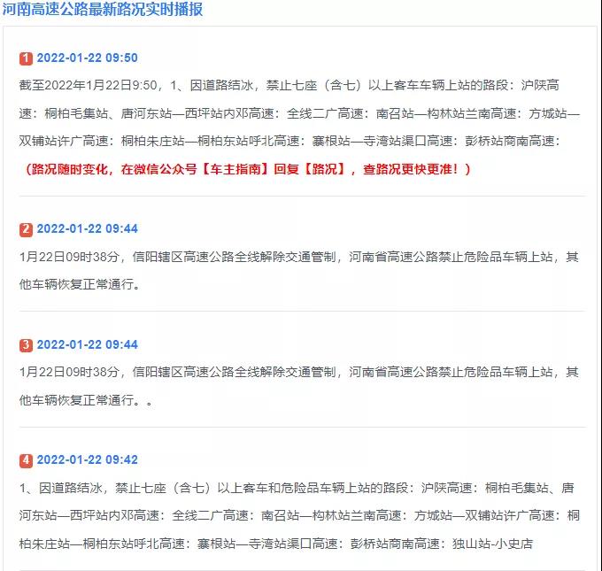 因道路結(jié)冰,禁止七座(含七)以上客車車輛上站的路段:滬陜高速;桐柏毛集站、唐河?xùn)|站—西坪站內(nèi)鄧高速;全線二廣高速;南召站—構(gòu)林站蘭南高速;方城站—雙鋪站許廣高速;桐柏朱莊站—桐柏東站呼北高速;寨根站—寺灣站渠口高速:彭橋站商南高速;信陽轄區(qū)高速公路全線解除交通管制,河南省高速公路禁止危險(xiǎn)品車輛上站,其他車輛恢復(fù)正常通行。