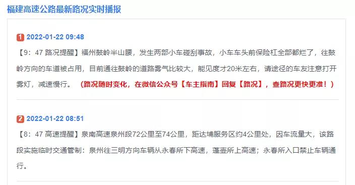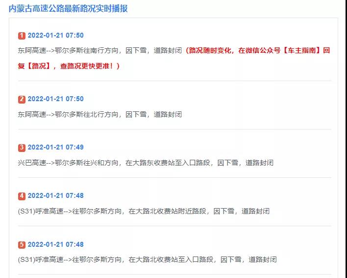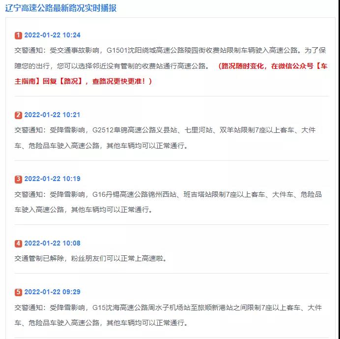 受降雪影響,G2512阜錦高速公路義縣站、七里河站、雙羊站限制7座以上客車、大件車、危險(xiǎn)品車駛?cè)敫咚俟?,其他車輛均可以正常通行。