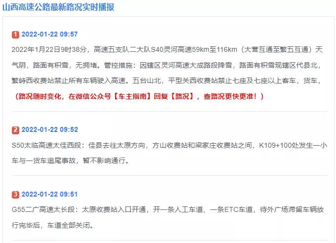 因轄區(qū)靈河高速大成路段降雪,路面有積雪現(xiàn)轄區(qū)代縣北,繁峙西收費(fèi)站禁止所有車輛駛?cè)敫咚?五臺(tái)山北,平型關(guān)西收費(fèi)站禁止七座及七座以上客車,貨車;五臺(tái)南、耿鎮(zhèn)、景區(qū)、陳家莊收費(fèi)站入口封閉,禁止所有車輛駛?cè)敫咚佟?br />