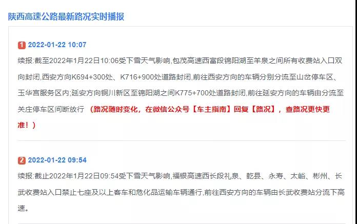 受下雪天氣影響,包茂高速西富段錦陽湖至羊泉之間所有收費(fèi)站入口雙向封閉,西安方向K694+300處、K716+900處道路封閉,前往西安方向的車輛分別分流至山岔停車區(qū)、玉華宮服務(wù)區(qū)內(nèi);延安方向銅川新區(qū)至錦陽湖之間K775+700處道路封閉,前往延安方向的車輛由分流至關(guān)莊停車區(qū)間斷放行。