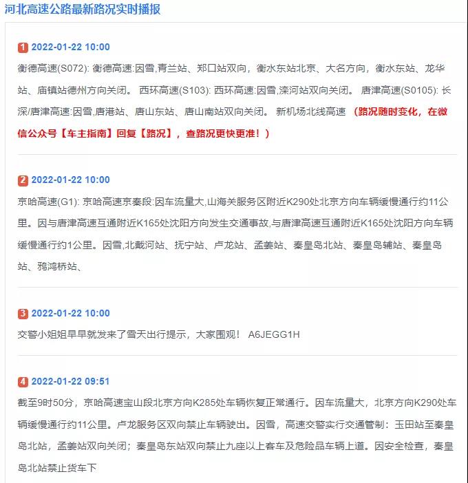 西環(huán)高速(S103):西環(huán)高速:因雪,灤河站雙向關(guān)閉。唐津高速(S0105):長深/唐津高速:因雪,唐港站、唐山東站、唐山南站雙向關(guān)閉。