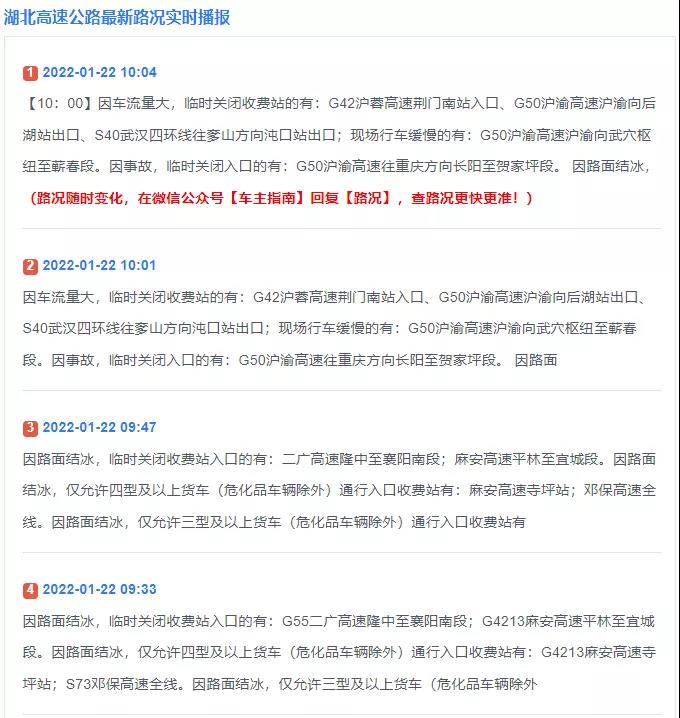 因惡劣天氣,臨時(shí)關(guān)閉入口收費(fèi)站的有:G55二廣高速黃集至十里段;G70福銀高速琚灣至土關(guān)埡段;S63雙尹高速全線。因路面結(jié)冰,僅允許三型以上貨車(三型及?;奋囕v除外)通行入口收費(fèi)站有:G4213麻安高速寺坪站;G70福銀高速隨州至棗陽段、武當(dāng)山至上津段;S73鄧保高速全線。