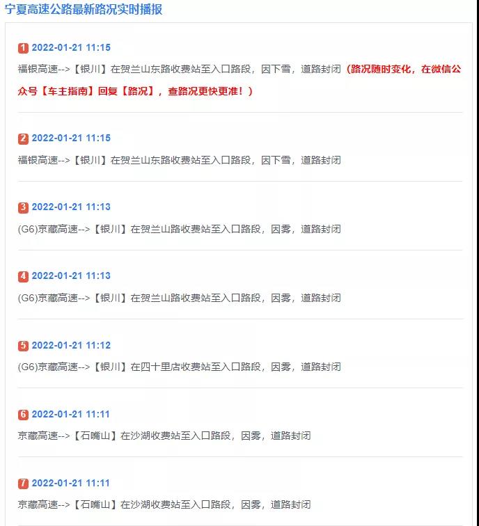 (G6)京藏高速-->【銀川】在賀蘭山路收費(fèi)站至入口路段,因霧,道路封閉。