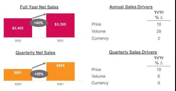 財報顯示,科慕鈦技術部門2021全年實現凈銷售額為33.55億美元,同比增長10億美元,即40%,因為所有終端市場和地區的需求從大流行水平恢復。銷量上漲28%,價格上漲10%。我們所有三個主要銷售渠道和地區的銷量和價格都是積極的。貨幣今年溫和上漲了2%。部門調整后的EBITDA增長2.99億美元至8.09億美元,或同比增長59%,因為凈銷售額增加抵消了成本逆風。全年分部調整后EBITDA利潤率上升300個基點至24%。