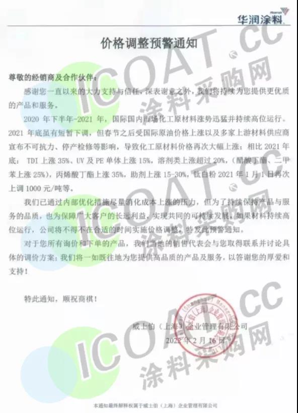 巴德士、阿克蘇諾貝爾等多家龍頭涂料企業(yè)發(fā)函宣漲