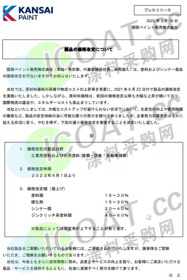 關(guān)西涂料:將于4月1日起實施漲價,最高上漲60%。