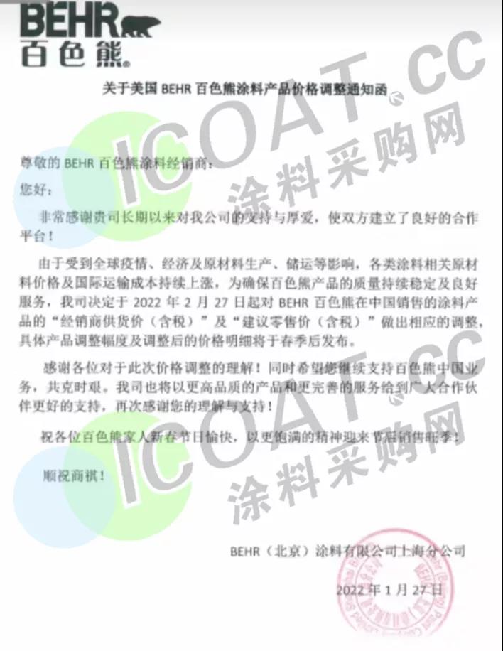BEHR(北京)涂料有限公司上海分公司:2月27日起,對BEHR百色熊在中國銷售的涂料產(chǎn)品的“經(jīng)銷商供貨價(含稅)”及“建議零售價(含稅)”做出相應(yīng)的調(diào)整,具體產(chǎn)品調(diào)整幅度及調(diào)整后的價格明細將于春季后發(fā)布。