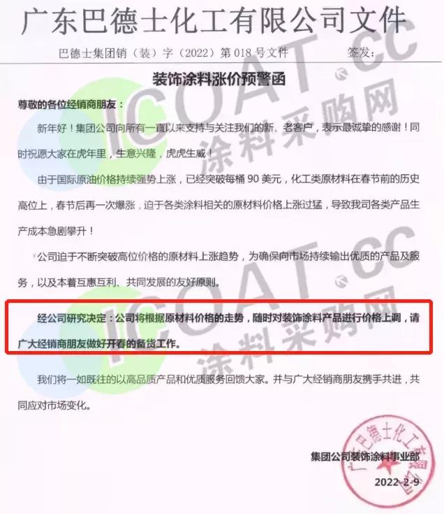 巴德士:將根據(jù)原料價格的走勢,隨時對裝飾涂料產(chǎn)品進行價格上調(diào),請廣大經(jīng)銷商朋友做好開春的備貨工作。