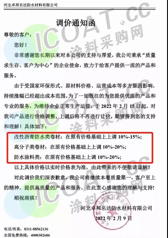 河北卓邦名達防水材料:對產(chǎn)品價格進行調(diào)漲,上調(diào)后將不再進行讓價。改性瀝青防水類卷材在原有價格基礎(chǔ)上上調(diào)10%-15%;高分子類卷材在原有價格基礎(chǔ)上上調(diào)10%-20%;防水涂料類在原有價格基礎(chǔ)上上調(diào)10%-20%。