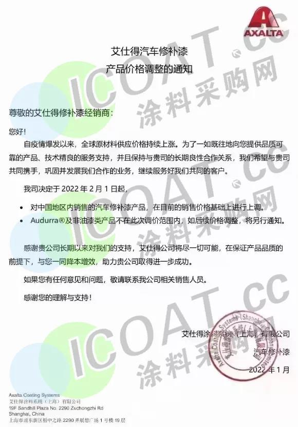 艾仕得:對中國地區(qū)內(nèi)銷售的汽車修補漆產(chǎn)品在目前的銷售價格基礎(chǔ)上進行上調(diào)。